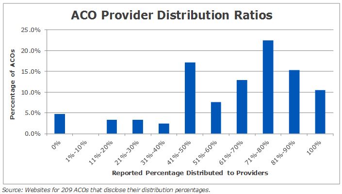 - Some ACOs report provider distributions as a percentage of shared savings revenue while others report as a percentage of profits (after operating expenses); most do not specify which.
