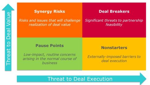 To make sense of what can be an extensive laundry list of risks and issues, it can be helpful to assess each one for its potential to threaten “Deal Execution” and “Deal Value,” as shown in the Deal Risk Matrix [Figure 1]. The matrix categories are discussed below.